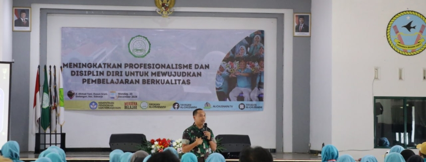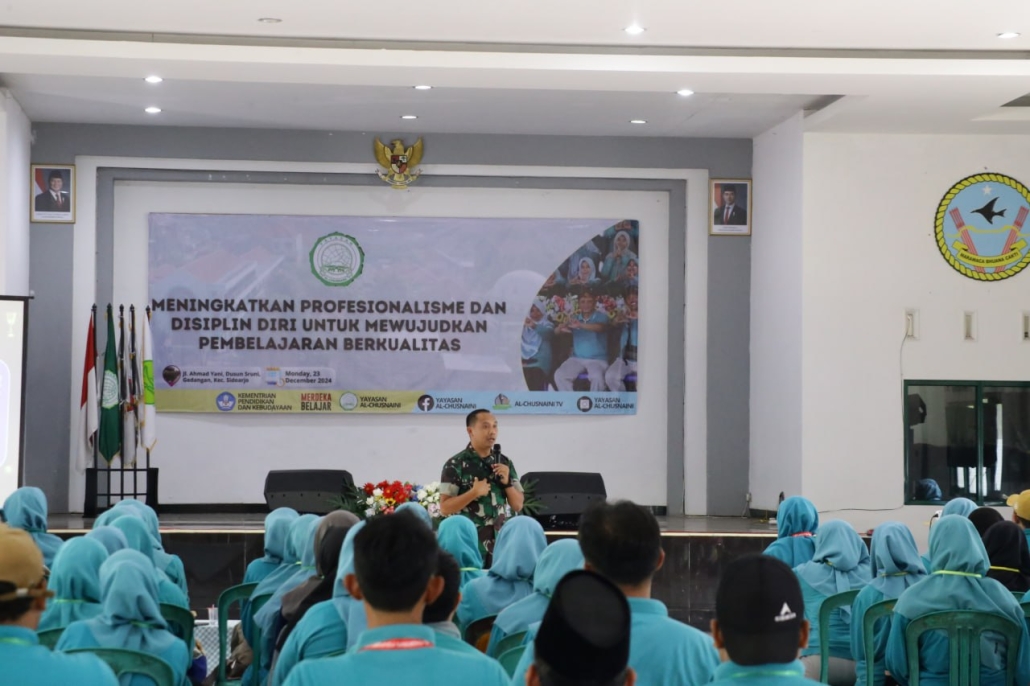 Sidoarjo,- Perwira Seksi Intelijen (Pasi Intel) Yonarhanud 8/MBC, Kapten Arh Siswoyo, memberikan pembekalan pada acara Teacher Work Meeting Yayasan Al-Chusnaini Foundation Academic Year 2024/2025.