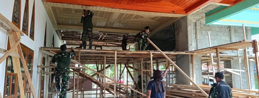 Pemasangan Atap Plafon Masjid Al-Muhajirin oleh Satgas Yonif 512/QY dan Masyarakat