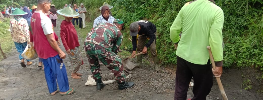 Magetan,- Anggota Koramil 0804/02 Plaosan Sertu Ali Lukman Babinsa Plumpung bersama warga masyarakat, melaksanakan kegiatan pembersihan jalan penghubung desa sebagai upaya untuk menjaga kebersihan dan mencegah erosi jalan biar jln penghubung biar tidak cepat rusak dan biar lancar.