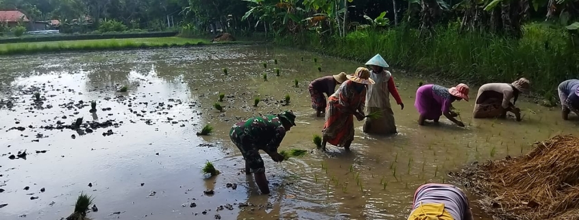 Sampang,- Dalam rangka mendukung program ketahanan pangan nasional, Babinsa Koramil 0828/03 Omben, Serka Nanang, bersama anggota Kelompok Tani (Poktan) Sekar Tani melaksanakan kegiatan penanaman padi di lahan milik petani di Desa Kebun Sareh, Kecamatan Omben. Kegiatan ini bertujuan untuk meningkatkan hasil pertanian dan mendorong swasembada pangan di wilayah tersebut.