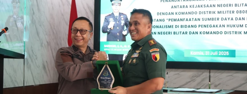 Blitar – Dalam rangka memperkuat sinergi antarinstansi di bidang penegakan hukum, Kejaksaan Negeri Blitar dan Kodim 0808/Blitar melaksanakan penandatanganan perjanjian kerjasama (PKS) pada Kamis (31/7/2025) bertempat di Aula Kantor Kejaksaan Negeri Blitar, Jl. Sudanco Supriyadi, Kelurahan Bendogerit, Kecamatan Sananwetan, Kota Blitar. Kegiatan ini diikuti oleh sekitar 50 peserta dari kedua institusi.