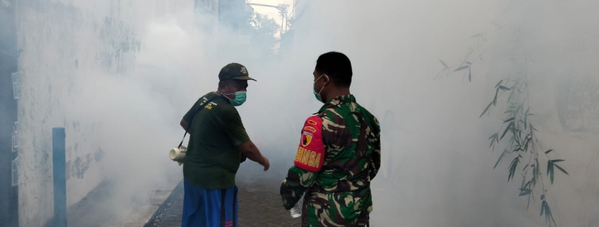 Surabaya — Dalam upaya mencegah penyebaran penyakit Demam Berdarah Dengue (DBD), Babinsa Kelurahan Sidosermo Koramil 0830/20 Wonocolo, Serda Sigit Handoko, bersama staf Kelurahan Sidosermo, mendampingi petugas kesehatan dari Puskesmas Sidosermo dalam kegiatan fogging atau pengasapan, Minggu (25/05).