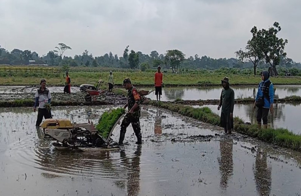 Blitar- Pendampingan terhadap petani terus dilakukan oleh Babinsa guna meningkatkan hasil pertanian sehingga mewujudkan ketahanan pangan wilayah. Seperti halnya yang dilakukan oleh Serda Dwiyono Hadi Sumarlin Babinsa Desa Kerjen Koramil 06/Srengat Kodim 0808/Blitar yang melaksanakan pendampingan, membantu Bapak Suwaji anggota Poktan 5, yang merupakan petani binaan di Desa Kerjen Kec. Srengat Kab. Blitar untuk menanam padi di sawah, Kamis (12/12/2024).
