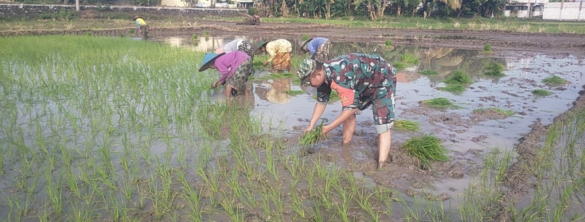 Pada pagi yang cerah itu, Serda Rofik tidak segan-segan turun ke areal persawahan yang tergenang air dan berlumpur, menyatu dengan para petani yang tengah sibuk menanam bibit padi. Babinsa yang dikenal dekat dengan warga ini turut memegang ikatan bibit dan menanam satu per satu, sejajar dengan barisan petani yang bekerja dengan penuh semangat.