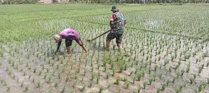 “ Membantu penyiangan gulma tanaman padi merupakan salah satu kegiatan pendampingan dan pengawalan yang rutin kami lakukan terhadap para petani di wilayah desa binaan, “ kata Serma Budi P.