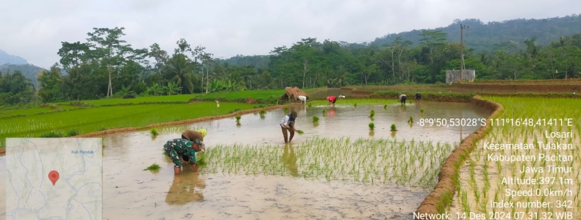 Seperti halnya yang dilakukan oleh Sertu Dwi Widodo Babinsa Ramil 0801/08 Tulakan melaksanakan kegiatan Ketahanan pangan bersama bapak Warjini dari Poktan Mekar sari 3 berupa penanaman padi di wilayah Desa Losari Kecamatan Tulakan Kabupaten Pacitan. Sabtu (14/12/2024).