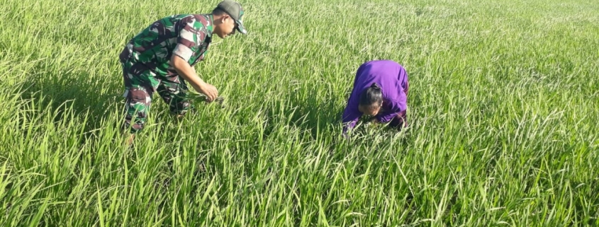 ” Kegiatan yang ada di wilayah desa binaan hari ini salah satunya yaitu membantu Bapak Kusnadi yang tergabung dalam Poktan Makmur yang melakukan penyiangan gulma tanaman padi di lahan seluas 3 kotak, ” kata Babinsa Japan.