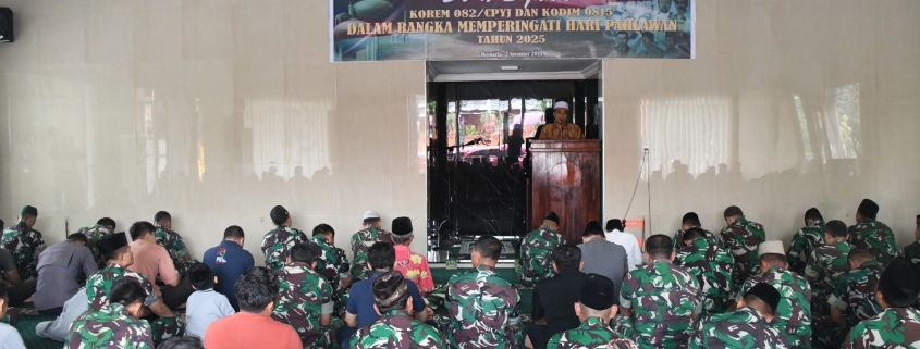 MOJOKERTO – Personel Kodim 0815/Mojokerto menghadiri Doa Syukur Bersama pada peringatan Hari Pahlawan 2025 di Masjid Roudhotul Iman Makorem 082/CPYJ, Jumat (07/11/2025). Kegiatan dipimpin Ustad M. Zainuri, S.Pd.I dan berlangsung khidmat sebagai penghormatan terhadap jasa para pahlawan bangsa. “Doa syukur ini menjadi pengingat tentang pengorbanan para pahlawan yang tidak boleh dilupakan,” ungkap Ustad Zainuri.