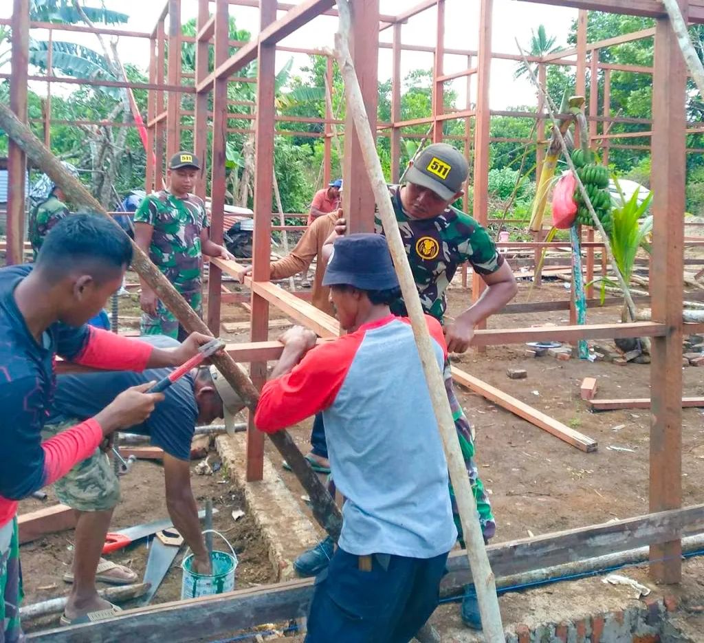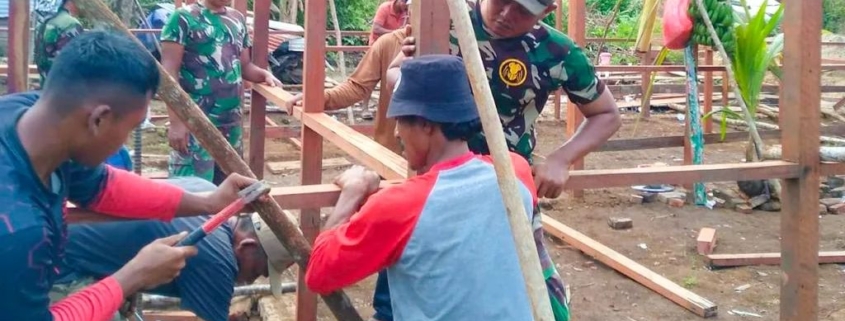 Merauke,- Demi meringankan beban masyarakat, Satgas Pamtas RI-PNG Yonif 511/DY Pos Komando Utama yang dipimpin oleh Sertu Kukuh Santoso beserta 10 anggota lainnya saling bahu-membahu membangun rumah warga di Kampung Sipias Bupul 1, Distrik Elikobel, Kabupaten Merauke. Jumat (24/3/2023).