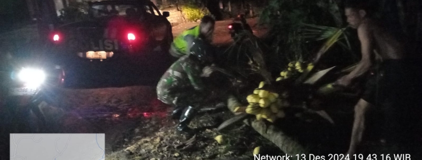 Mendengar kejadian tersebut,Babinsa kopda Erik serta anggota Polsek dengan cekatan menuju TKP untuk melalukan pembersihan pohon yg tumbang menutupi jalan di bantu dengan masyarakat sekitar.