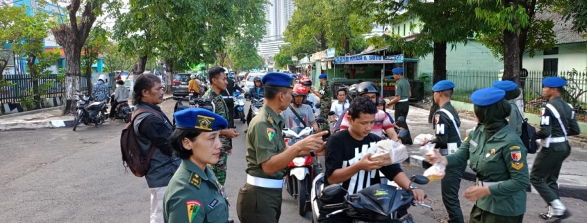 Surabaya,- Untuk kedua kalinya Pomdam V/Brawijaya menggelar aksi bagi-bagi takjil pada warga Surabaya, khususnya di sekitaran Asrama Pomdam. Sasaran bagi-bagi takjil itu, ialah para pengendara maupun pejalan kaki yang melintas di depan halaman Asrama Pomdam V/Brawijaya, Surabaya.