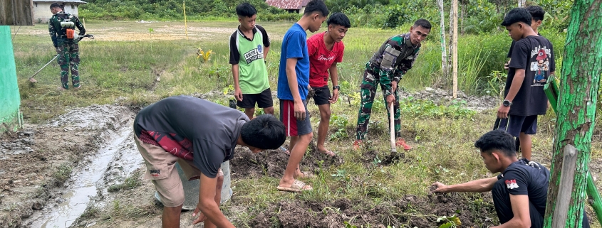 Sintang,- Dalam upaya meningkatkan ketahanan pangan dan kebersihan lingkungan, Pos Nanga Bayan mengajak para siswa SMPN 4 Nanga Bayan melaksanakan giat berkebun dan pembersihan lingkungan sekitar sekolah. Kegiatan ini diikuti oleh siswa SMPN 4 dan anggota Satgas Pamtas di Desa Nanga Bayan, Kecamatan Nanga Bayan, Kabupaten Sintang, Kamis (27/2/2025).