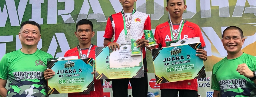 Pratu Muhammad Rizal sebagai juara 2 dengan catatan waktu 41 menit 24 detik dan Pratu Rio Subandri sebagai juara 3 dengan catatan waktu 42 menit 49 detik pada event Wira Yudha Trail Run yang diselenggarakan oleh Brigif 16 dengan jarak 8 Km. Minggu, (20/4/2025)