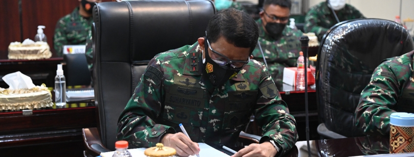 Pangdam V/Brawijaya Mayjen TNI Suharyanto, S.Sos., M.M menghadiri rapat rutin Monev pelaksanaan Vaksinasi Covid-19 yang dipimpin langsung oleh Menteri Kesehatan RI melalui konferensi video di Ruang Puskodalopsdam V/Brw, Surabaya. Senin, 25 Januari 2021.