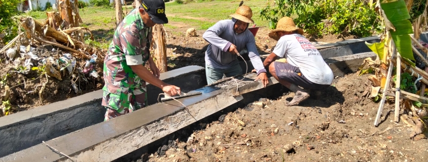 SUMENEP – Babinsa Koramil 0827/06 Saronggi Serka M. Jakfar bersama warga gotong royong bangun saluran irigasi sepanjang 100 meter.
