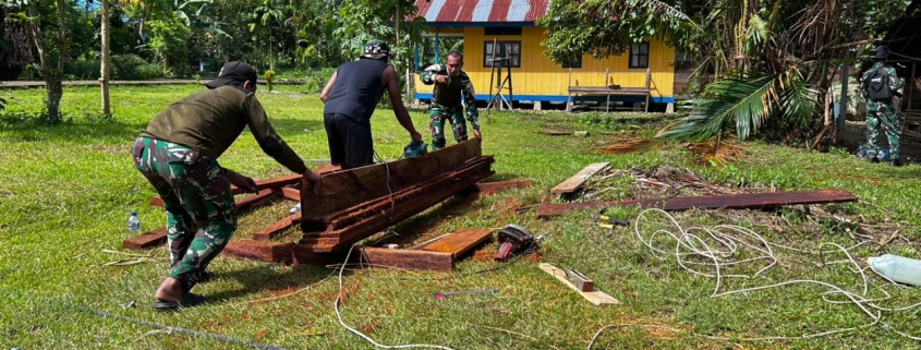 MEMBRAMO RAYA – Satgas Yonif 511/DY Pos Dabra melaksanakan karya bakti pembangunan MCK umum di Gereja Jemaat Domine Eduard Kututung Dabra II. Kegiatan ini menjadi langkah penting dalam meningkatkan sanitasi masyarakat setempat melalui dukungan nyata TNI dalam pembinaan teritorial terpadu pada wilayah penugasan.