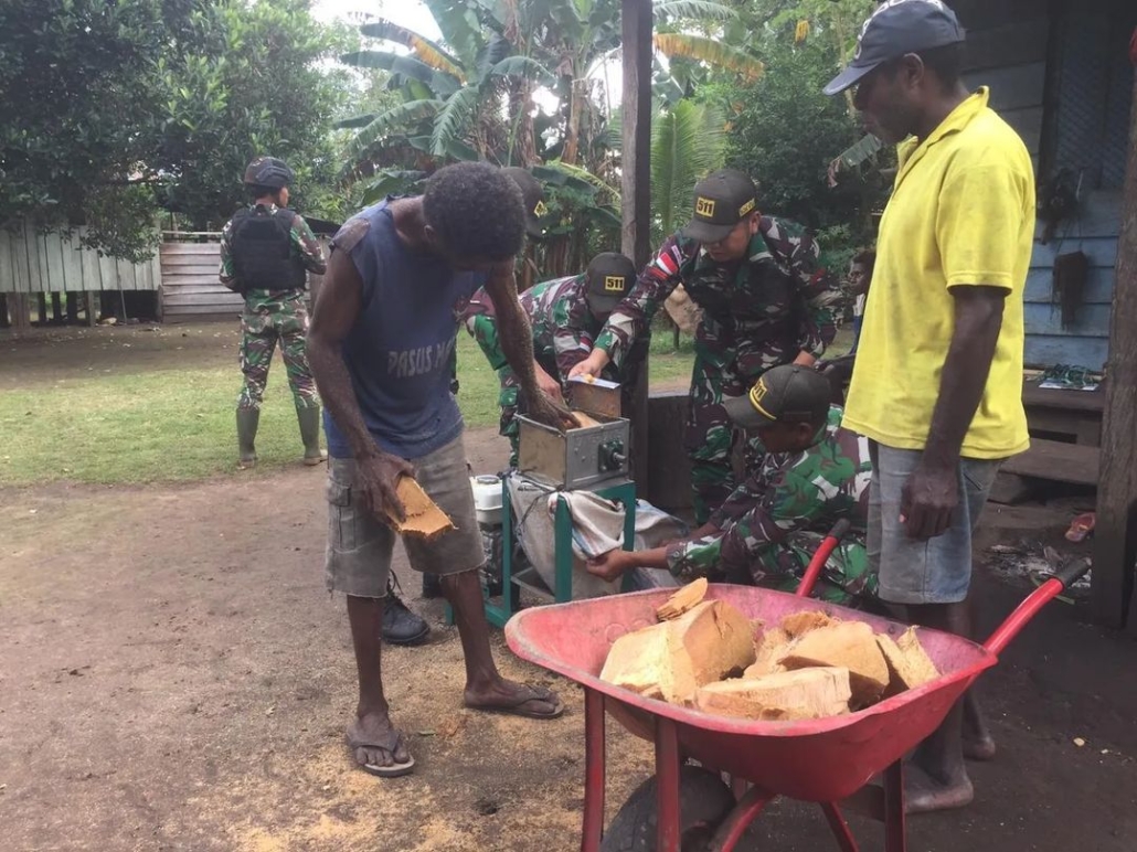 Satgas Yonif 511/DY Berikan Bantuan Mesin Pemarut Sagu Kepada Masyarakat Perbatasan RI-PNG