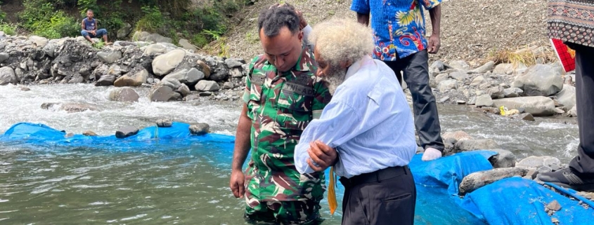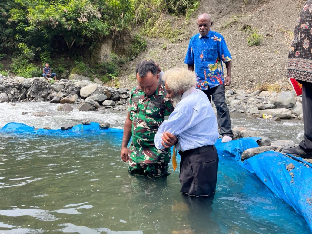 TOLIKARA — Satgas RI–PNG Kewilayahan Yonif 511/DY Pos Kanggime menghadiri acara Pembaptisan Kudus dan Peneguhan Sidi Jemaat Gereja Kelapa Tiga bagi anggota Koramil Kanggime, Pratu Titus, yang dilaksanakan di Kali Kanggi, Distrik Kanggime, Kabupaten Tolikara, Papua Pegunungan.