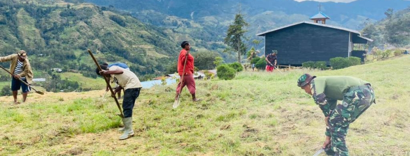 LANNY JAYA – Personel Satgas Pamtas RI-PNG Kewilayahan Yonif 511/DY Pos Balingga melaksanakan Karya Bhakti membersihkan Gereja Baptis Mowi di Distrik Balingga, Kabupaten Lanny Jaya, Papua Pegunungan, Senin (27/10/2025). Kegiatan ini dilakukan atas permintaan pengurus Gereja dan Staf Distrik Balingga.