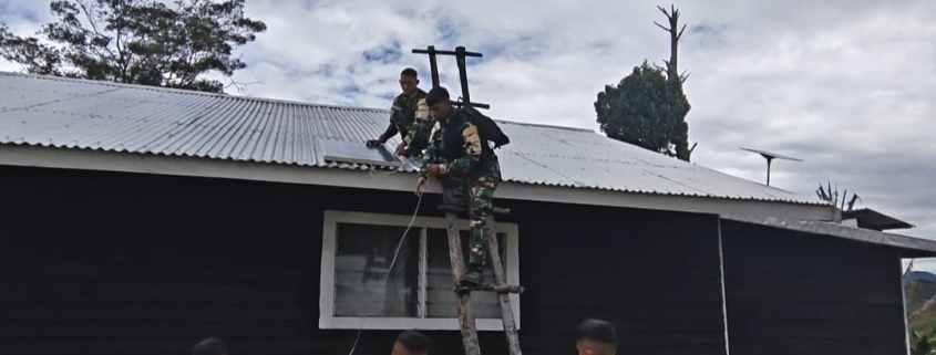 LANNY JAYA – Menyambut perayaan Natal dan Tahun Baru 2026, Satgas Pamtas RI-PNG Kewilayahan Yonif 511/DY Pos Popome melaksanakan kegiatan perbaikan instalasi lampu solar cell di Gereja Kampung Popome, Distrik Mokoni, Kabupaten Lanny Jaya, Sabtu (29/11/2025).