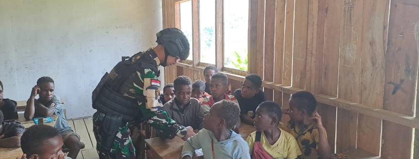 LANNY JAYA – Satgas Pamtas RI-PNG Yonif 511/DY Pos Balingga melaksanakan kegiatan mengajar menggunakan metode Gasing di SD Inpres Brume sebagai upaya meningkatkan kualitas pendidikan di pedalaman Papua Pegunungan. Kegiatan ini menjadi bentuk nyata kontribusi TNI terhadap perkembangan pendidikan di wilayah perbatasan. Siswa menerima pembelajaran dengan antusias.