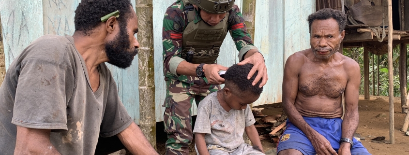 Satgas Yonif 512/QY Cukur Rambut Untuk Masyarakat Kampung Tatakra sebagai Wujud Cinta Tanah Air.