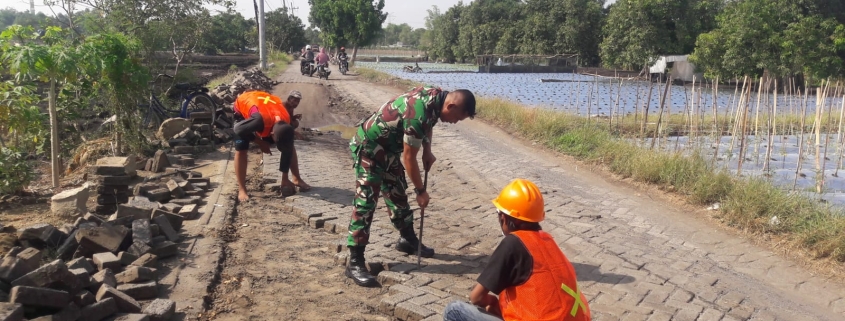 Gresik,– Babinsa Koramil 04/Menganti Kodim 0817/Gresik, Kopka Ketut Sukerama, bersama warga Desa Randupadangan, Kecamatan Menganti, melaksanakan kegiatan Karya Bakti berupa gotong-royong pemasangan paving block jalan desa. Kegiatan ini dilakukan untuk meningkatkan kualitas infrastruktur jalan agar lebih nyaman digunakan, terutama saat musim penghujan.