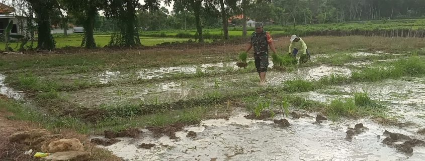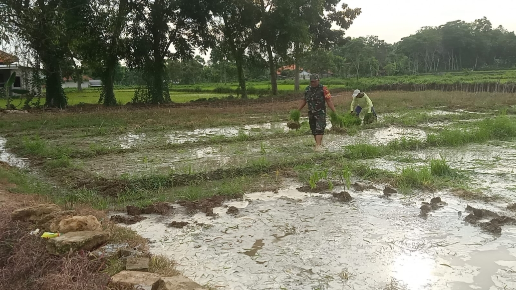 Sertu Moh Fauzi Bantu Warga Desa Taraban Proses Penanaman Padi Secara Langsung