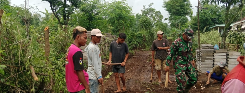 PROBOLINGGO, Koramil 0820-07/Wonomerto berkolaborasi dengan Pemerintah Desa Wonorejo dan masyarakat setempat melaksanakan kerja bakti membersihkan jalan desa, Senin (08/12/2025). Kegiatan ini bertujuan mempersiapkan pemasangan paving dan meningkatkan kebersihan lingkungan.