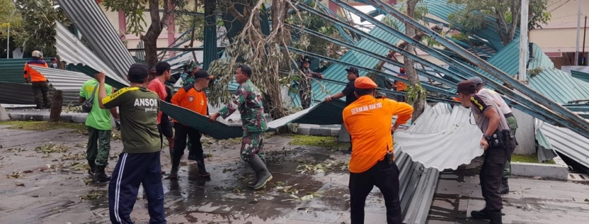 BLITAR – Pasca hujan lebat disertai angin kencang yang melanda Kecamatan Nglegok, Kabupaten Blitar, Selasa (14/10/2025), anggota TNI, Polri, BPBD, dan masyarakat melaksanakan kerja bakti membersihkan puing-puing reruntuhan atap Stadion Gelora Penataran. Kegiatan ini berlangsung hingga Kamis (16/10/2025).
