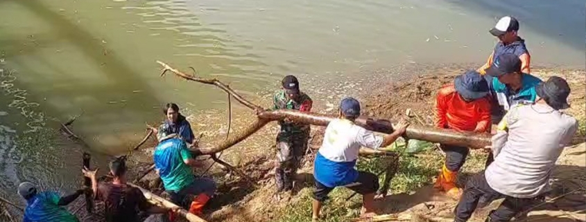 Para peserta kerja bakti berjibaku menarik carang bambu ori yang menyangkut di pondasi jembatan. Material tersebut berpotensi menghambat aliran sungai dan menyebabkan luapan air ke permukiman warga apabila tidak segera diatasi secara bersama.