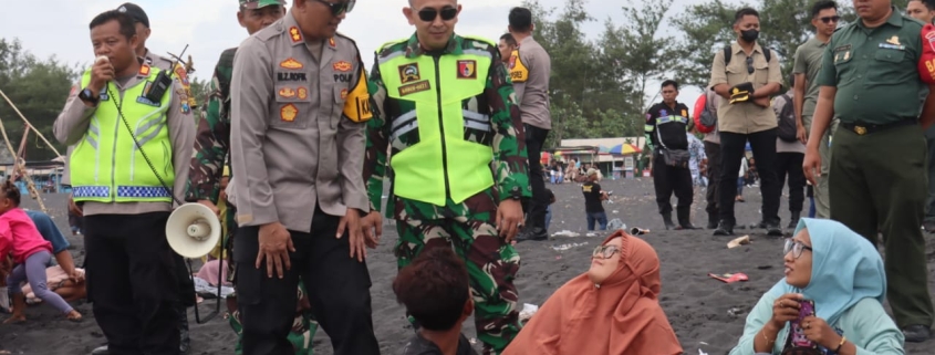 Lumajang,– Kasdim 0821 Lumajang, Mayor Inf Aditya Kurnia Rahman bersama Kapolres Lumajang, AKBP Muhammad Zainur Rofik, S.I.K., dan jajarannya melakukan peninjauan keramaian di Pantai Watu Pecak, Kecamatan Pasirian, Kabupaten Lumajang.
