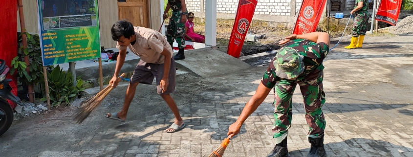 Satgas TMMD fokus melakukan pembersihan di bagian depan rumah sebagai bagian dari tahapan akhir pekerjaan. Meski rumah belum selesai sepenuhnya, semangat gotong royong antara anggota Satgas dan warga setempat tetap menyala dalam menyelesaikan setiap detail pekerjaan.