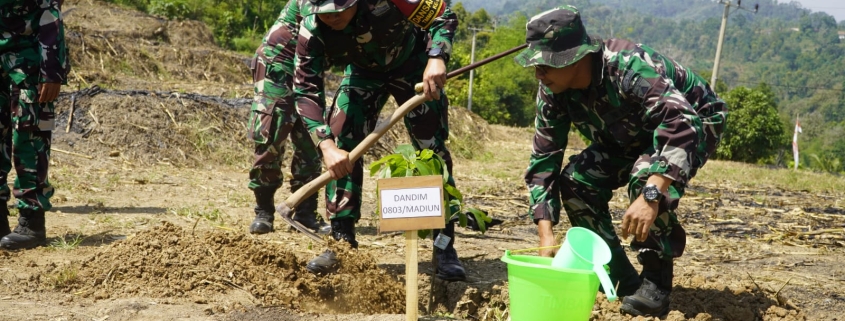 Madiun, — Dalam rangka mendukung program pelestarian lingkungan dan mempererat kemanunggalan TNI dengan rakyat, Satuan Tugas TNI Manunggal Membangun Desa (TMMD) ke-125 Kodim 0803/Madiun menggelar kegiatan penanaman pohon di wilayah sasaran TMMD, bertempat di Desa Ngranget, Kecamatan Dagangan, Kabupaten Madiun.