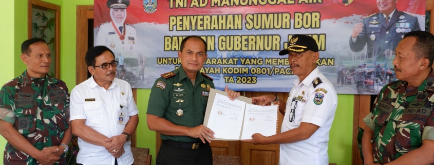 PACITAN. Pendam V || Sinergi TNI AD Kodam V/Brw dan Provinsi Jatim Bersama-sama Mewujudkan Ketersediaan Air Bersih di Jatim. Dalam upaya mewujudkan ketersediaan air bersih bagi masyarakat, Kodam V/Brw Manunggal Air bekerja sama dengan Provinsi Jatim meluncurkan program sumur bor. Penyerahan sumur bor ini dilakukan secara simbolis oleh Dandim 0801/Pacitan di Sukodono, Kecamatan Donorojo, Kabupaten Pacitan.