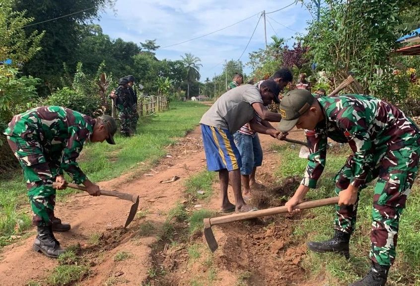 TNI Berbakti, Satgas Yonif 511/DY Bersama Warga Perbaiki Jalan Perkampungan