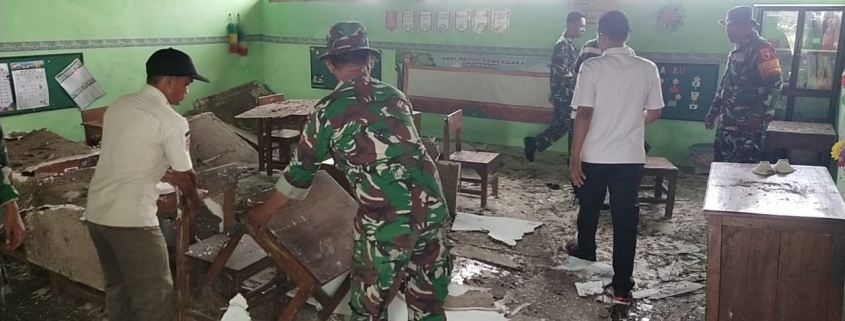 “Kehadiran personel TNI Polri tentu saja hal ini sebagai wujud sinergitas bersama masyarakat dalam membantu membersihkan ruang kelas akibat atap ambrol.