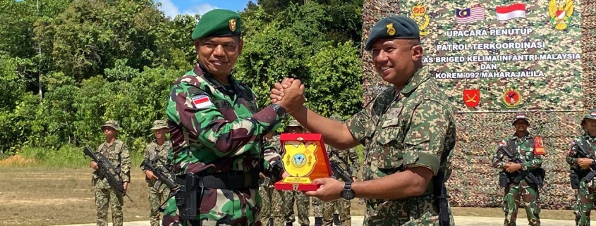 NUNUKAN. Pendam V || Wadankolakops Rem 092/Maharajalila Kolonel Inf Utten Simbolon bersama Ketua Staf Markas 5 Briged Infantri TDM Leftenan Kolonel Mohd Roslaini Bin Bujang menutup kegiatan Patroli Terkoordinasi (Patkor) Seri II/ 2023 bertempat di Pos Serudong Malaysia.