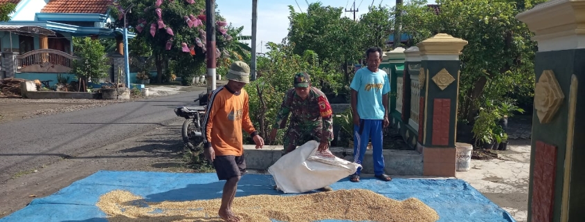 Jombang – Dalam upaya mendukung ketahanan pangan nasional, Babinsa Koramil 0814/12 Kesamben, Kabupaten Jombang, terjun langsung melakukan pendampingan penjemuran hasil panen padi milik petani di Desa Carangrejo, Kecamatan Kesamben, Kabupaten Jombang. Kamis (20/03/2025).