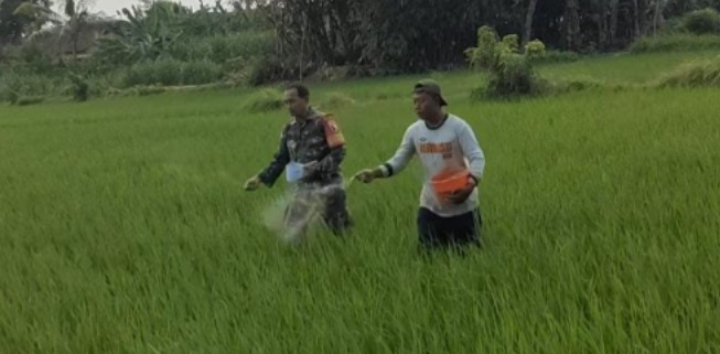 Upaya Meningkatkan Hasil Panen: Babinsa Ngunut Dampingi Petani dalam Pemupukan Padi.