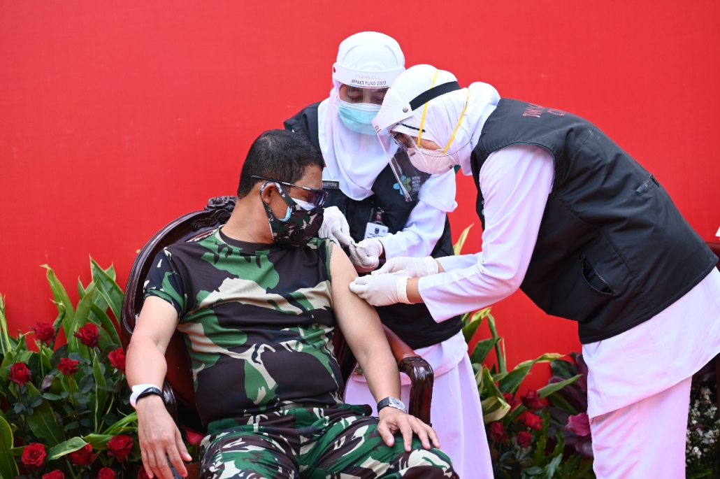 Pangdam V/Brawijaya Mayjen TNI Suharyanto, S.Sos., M.M. menerima vaksinasi Covid-19 tahap kedua di Halaman Kantor Gubernur Jatim (taman) Jl. Pahlawan No. 110, Surabaya. Kamis, 28 Januari 2021.