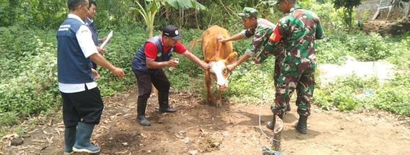 Mojokerto, – Sebagai langkah antisipasi penyebaran Penyakit Mulut dan Kuku (PMK) pada hewan ternak sapi dan kambing, Babinsa Ngoro Koramil 0815/12 Ngoro Kodim 0815/Mojokerto Serda Choirul Huda dampingi kegiatan vaksinasi pada hewan ternak di Desa Ngoro, Kecamatan Ngoro, Kabupaten Mojokerto, Jawa Timur.
