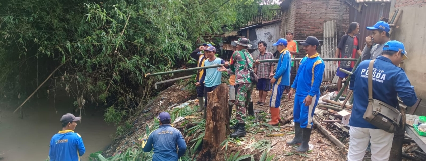 Jombang — Babinsa Kademangan, Serka Khotib dari Koramil 0814-10/Mojoagung, bersama warga setempat melaksanakan kegiatan pembersihan pohon bambu yang roboh di bantaran Sungai Bondalem. Pohon bambu tersebut tumbang akibat tergerus aliran sungai, mengganggu ekosistem dan potensi banjir.