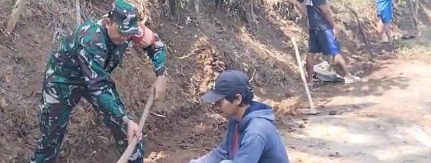 Blitar,- Bintara Pembina Desa (Babinsa) Tapakrejo Koramil 0808/14 Kesamben Kodim 0808 Blitar Serda Anjas, bersama warga Desa Tapakrejo mengadakan kerja bakti bahu- membahu untuk membersihkan jalan kampung dan parit bertempat di Dusun Sumbermangku, Desa Tapakrejo Kecamatan Kesamben Kab. Blitar, Sabtu (28/12/2024).