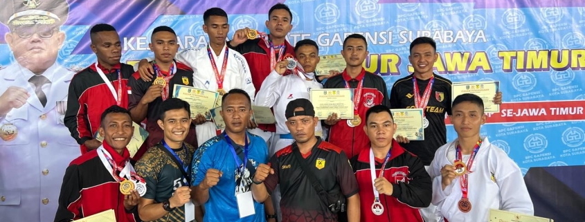Surabaya,- Pada hari Minggu, 27 April 2024, pukul 20.30 WIB, pertandingan karate Piala Gubernur Gapenasi CUP yang diselenggarakan di GOR Kampus UNESA telah selesai dilaksanakan dengan aman. Kontingen Yonif 511/DY meraih hasil gemilang dengan perolehan 7 medali emas, 10 medali perak, dan 3 medali perunggu.